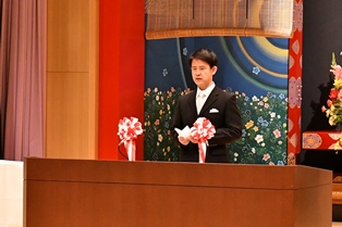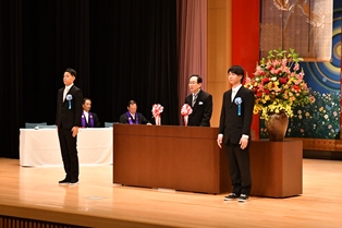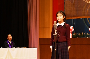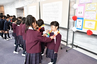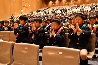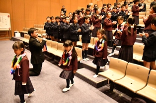 来賓の方をはじめ、保護者、在校生、教職員全員の温かな拍手に迎えられて新入児が入場しました。念珠授与では、新入児達は少し緊張した面持ちで講堂の舞台上にのぼりました。そして、舞台上で自分の名前が呼ばれると、大きな声で返事をし、理事長先生から念珠を手渡されると「頑張ります!」と立派に宣言することができました。式は厳粛に行われ、新入児にとって大切な節目となりました。
