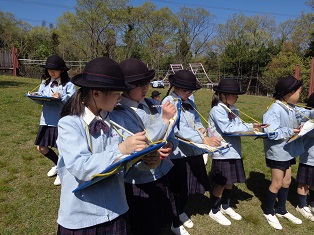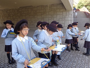 奈良カレッジ内の芝生の広場や遊具の広場、ピロティ、校門付近など、様々な場所で方位を調べました。児童たちは、最初は方位磁針の使い方に戸惑いながらも、何回も調べていくうちに慣れ、正確に方位を調べることができました。この技術を活かして、26日(金)に関屋フィールドワークに出かけ、学校周辺の地図作りにチャレンジする予定です。