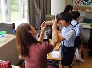 万華鏡づくり大会をしました。紙筒にスパンコールを入れ、塩化ビニルのシートを鏡の代わりにして制作しました。