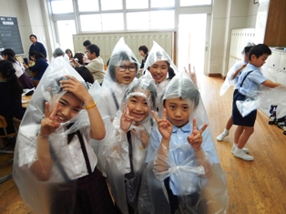 地震などの災害に備えて、身近な物で簡単に作れるマスクや雨合羽を親子で作りました。