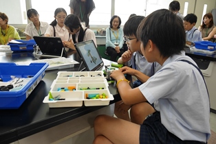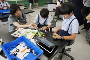 「レゴ造形選手権」を行いました。レゴブロックで好きな形のロボットを作ったあと、タブレット端末で簡単なプログラミングを行い、ロボットを動かしました。