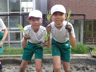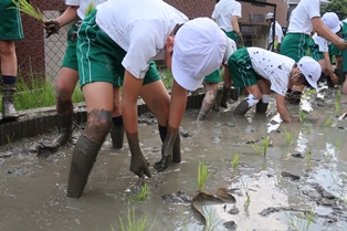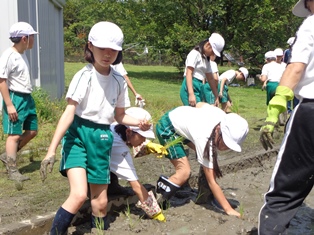 里山 352.田植え(4年生) 2019年6月24日 2019年7月23日 6月24日(月)に4年生が田植えをしました。 校内にある田んぼを事前に自分たちで耕し、そこにイネの苗を植えました。 児童たちは泥んこになりながら、苗がすくすく育つように心を込めて作業をしていました。 田植えをする児童① 田植えをする児童② 田植えをする児童③ イネを持って記念撮影