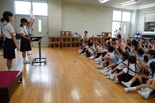 行事 355.七夕集会 2019年7月5日 2019年7月19日 7月4日(木)に七夕集会、7月5日(金)に七夕の飾りつけを行いました。 七夕集会では、図書委員が七夕にまつわる紙芝居をし、代表委員がクイズを出しました。 七夕の飾りつけでは、6年生と1・2年生が一緒に飾りを作り、児童たちは作った飾りや短冊を、願い事が叶うようにと心をこめて丁寧に笹に結びつけていました。 図書委員による紙芝居 代表委員による七夕クイズ 飾りつけ① 飾りつけ②