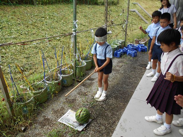 里山 367.スイカ割り(2年生) 2019年8月29日 8月29日(木)に2年生が校内の学習農園で育てたスイカでスイカ割りをしました。 目隠しをしてスイカを割ることは難しく、最初はなかなか割ることができませんでした。しかし、周りの子の応援が少しずつ増えていき、見事にスイカを割ることができました。 最後はみんなでスイカをおいしくいただき、夏の風物詩を楽しみました。 スイカ割り...