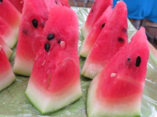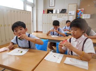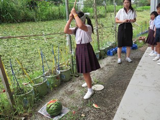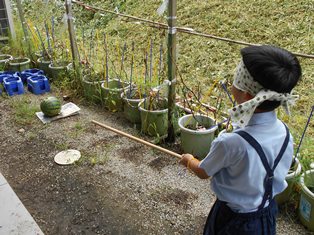 里山 367.スイカ割り(2年生) 2019年8月29日 2021年12月15日 8月29日(木)に2年生が校内の学習農園で育てたスイカでスイカ割りをしました。 目隠しをしてスイカを割ることは難しく、最初はなかなか割ることができませんでした。しかし、周りの子の応援が少しずつ増えていき、見事にスイカを割ることができました。 最後はみんなでスイカをおいしくいただき、夏の風物詩を楽しみました。 スイカ割りに挑戦① スイカ割りに挑戦② スイカを食べる児童 甘いスイカ
