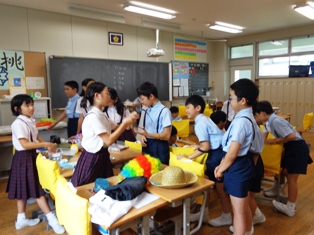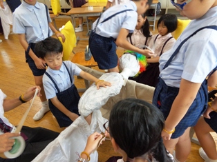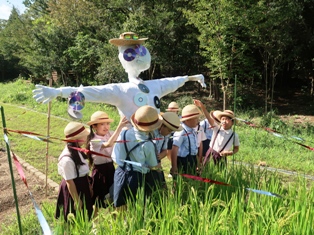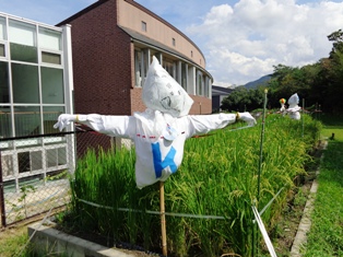 里山 368.かかし作り(4年生) 2019年8月29日 2021年12月15日 8月28日(水)、29日(木)の2日間でかかし作りをしました。 竹や新聞紙、古着などを使って、かかしを作りました。みんなで協力しないと持ち上がらないくらい大きなかかしができました。作ったかかしは、学内の田んぼに設置され、鳥などから稲穂を守っています。 どんなかかしを作るか相談 みんなで協力してかかしの組立 田んぼに設置 鳥から穂を守っているかかし