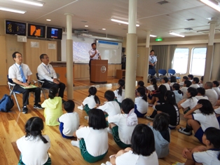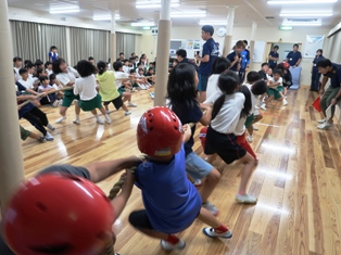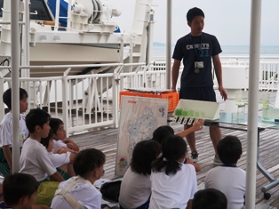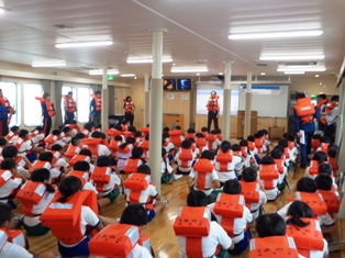 児童たちは、大津港から乗船し、開校式、避難訓練を行った後、午後から長浜港で下船し、長浜タウンウォークラリーを行いました。うみのこの夕べでは、自分の学校をクイズや劇を交えて紹介した後、白熱した綱引き大会を楽しみました。