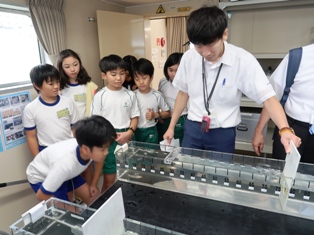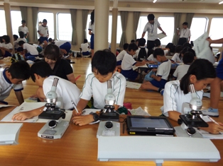 そのまま船内で1泊し、2日目は環境学習を行いました。琵琶湖の生き物観察や水質に関する実験では、普段できない実験に目を輝かせて取り組んでいました。最後はお世話になったうみのこをきれいに掃除をしました。解散式では、三雲小学校の児童にありがとう、またね、さようならと声をかける児童の姿が見られ、充実した2日間を過ごせたようです。