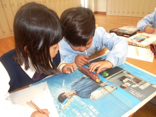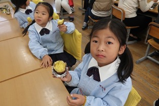 土の中から芋を見つけ出すのは一苦労でしたが、とても大きな芋がたくさん採れ、児童だけでなく保護者の方々も驚いていました。児童たちは収穫したサツマイモを観察し、所々サツマイモの表面に色の違いがあることに気付き、丁寧に絵や文章に表していました。里山で出た間伐材でつくった炭で、サツマイモを焼きました。出来上がった焼き芋は、熱々でおいしく、児童たちはとても喜んでいました。