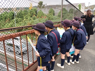 児童たちは、学校の周りにある建物や道路設備、高速道路の車の数などを調べました。児童たちは、楽しそうに、かつ意欲的に自分の地図にメモをしていました。今回発見したことをグループで発表し、絵地図を作っていきます。