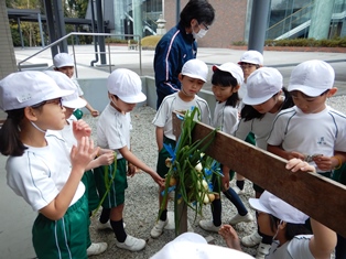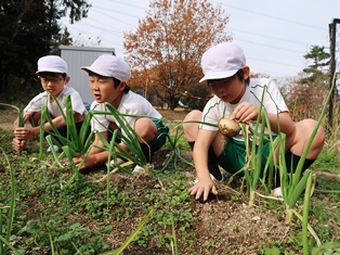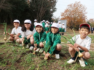 7月末から育ててきたタマネギを収穫するということで、児童たちはわくわくしながら、畑に集まりました。タマネギは、想像以上にしっかりと根を張っていたので、収穫に手こずりました。タマネギの大きさは大小様々ではありますが、児童たちは嬉しそうにタマネギを収獲していました。
