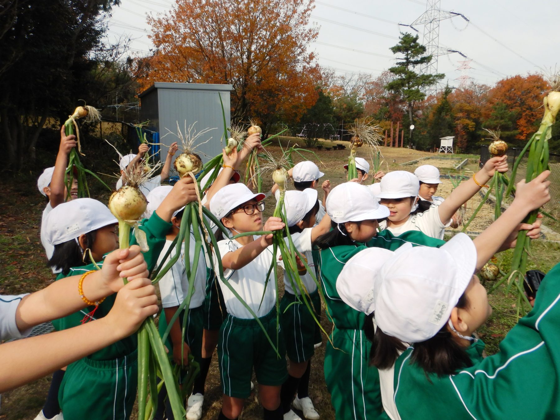 7月末から育ててきたタマネギを収穫するということで、児童たちはわくわくしながら、畑に集まりました。タマネギは、想像以上にしっかりと根を張っていたので、収穫に手こずりました。タマネギの大きさは大小様々ではありますが、児童たちは嬉しそうにタマネギを収獲していました。