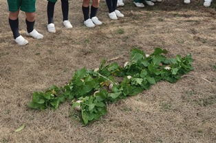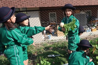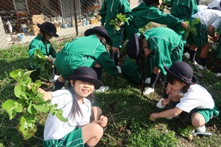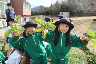 国語の教科書に出てくる「大きなかぶ」のように友達と力を合わせてカブを抜きました。「家に帰ったらお母さんにお味噌汁に入れてもらおう。」「葉っぱをふりかけにしたいな。」など、カブを家庭に持ち帰って食べることを楽しみにしていました。