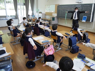4月7日以来の登校で、児童たちはお互いの距離を保ちながらも、久しぶりに会えたことが、とてもうれしいようでした。