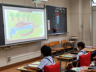 2年生は、自分の描いた絵に声を入れて動画をつくりました。少し緊張した様子で録音していましたが、1年生にしっかり伝わるよう一生懸命頑張っていました。