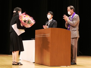 永年勤続職員表彰式では、本校に長きにわたって勤務されている先生に、理事長先生から表彰状と花束が贈られました。表彰時は児童たちから、盛大な拍手が送られました。