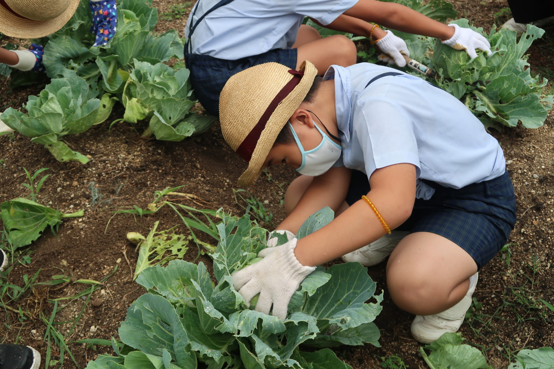 里山 414.キャベツの収穫 2020年9月2日 8月28日(金)に、3年生がキャベツの収穫をしました。 今年は天候に恵まれず、玉は小ぶりになりました。しかし、毎日水やりをしていたキャベツを収穫することができて、児童たちはうれしそうでした。 持って帰って食べてみると、シャキシャキしていて芯まで美味しかったそうです。 収穫の方法の説明を聞いています。 「茎が太くてな...
