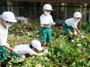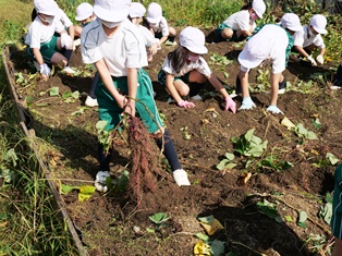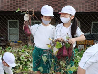 里山 421.芋掘り(1年生) 2020年10月24日 2021年12月15日 10月24日(土)に、1年生がさつまいも掘りを行いました。長く伸びたサツマイモのつるをひっぱり、芋づる式に芋がとれた児童もいれば、土を掘り、自分の顔より大きい芋を探し出した児童もいました。児童たちは、各々でお気に入りの芋を選び、各家庭に持ち帰り、おうちでサツマイモ料理を楽しみました。 さつまいもはどこかなー こんなにおおきなのがとれた! 土の中からたくさん! 最後はみんなで記念撮影!