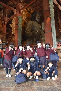 東大寺南大門付近でシカと触れ合った後、東大寺大仏殿、正倉院、二月堂を巡るクイズラリーをしました。児童たちは、古くからの建造物に触れ、その大きさや歴史的な意味に関心を持って見ていました。