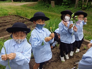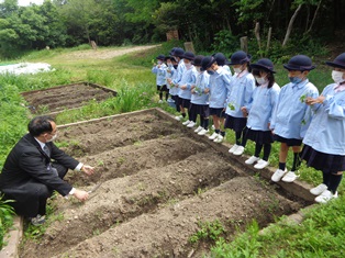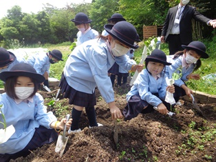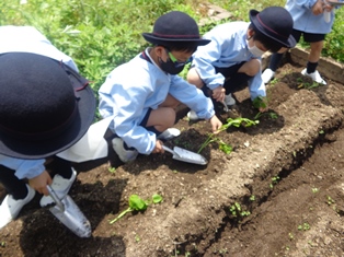 里山 451.サツマイモの苗植え(1年生) 2021年5月25日 2021年6月2日 5月25日(火)に、1年生が、生活の授業でサツマイモの苗植えをしました。 畑の畝に、児童が1本ずつ丁寧に苗を植えていきました。 登校後、児童はサツマイモに水やりをしながら、「大きなサツマイモができたらいいな。」「家に持って帰って食べるのが楽しみだな。」と話し合っています。 先生の話をよく聞いて植えます サツマイモの苗 スコップで土を掘って植えます 大きいサツマイモできるかな