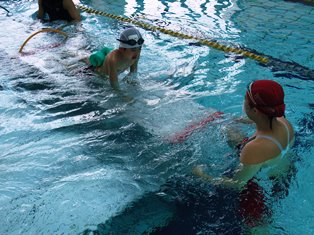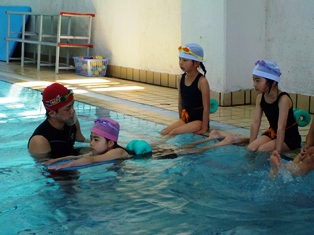 児童たちは泳力でグループに分かれ、スポーツクラブのコーチから優しく丁寧に指導していただきました。