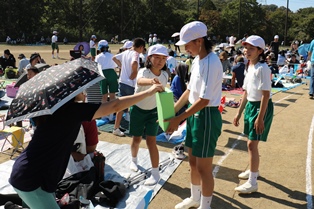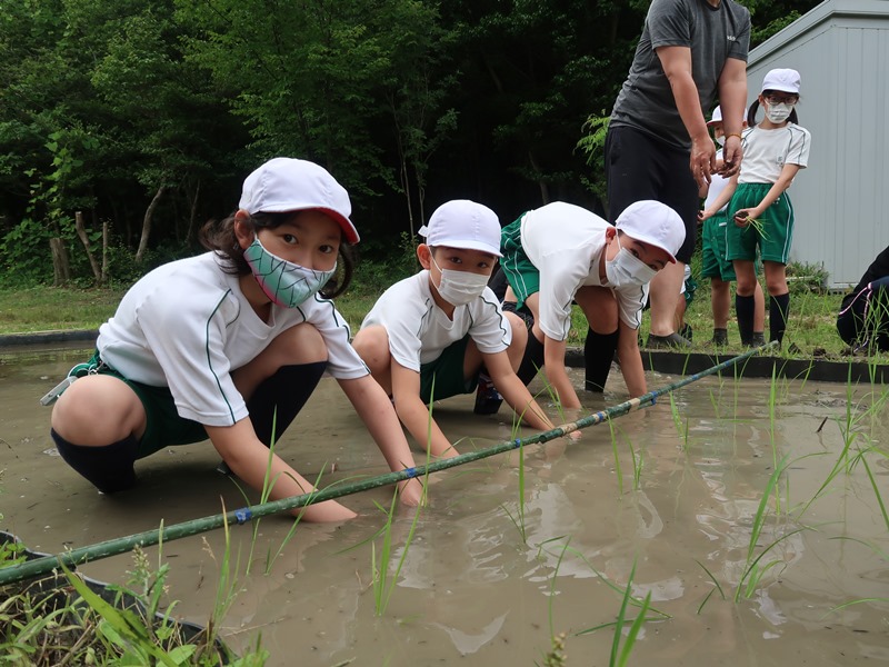 田植え当日、児童たちは交代で田んぼに入り、一苗ずつ丁寧に植えていきました。泥に手足を入れるという珍しい体験に児童たちは少し興奮しながら 、苗が根付くようにしっかり植え付けることができました。