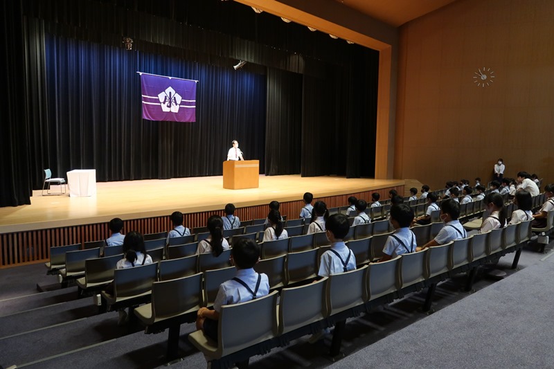 校長先生からは、「コロナ禍の中でこの1学期を無事に終えられたのは、児童や保護者の皆さん、先生方の協力のお蔭です。皆さんは1学期よく頑張りました。夏休みの間に1学期の振り返りをして、各自の課題を見つけ、2学期にがんばることを考えておきましょう。今年は東京オリンピックが開催され、多くの感動をもらっています。しかし、過去に戦争のために東京オリンピックが中止になったこともありました。戦争は人の命だけでなく、学びの機会も奪います。夏休み中には終戦記念日など戦争について考える機会もあります。皆さんも平和のありがたさについて考え、当たり前のように学べることを感謝し、しっかり勉強してください。最後に、夏休みは、健康と安全を第一に過ごす、規則正しい生活をする、家の手伝いを積極的にするように頑張ってください。2学期には全員元気に登校してくれることを願っています。」とご訓示がありました。