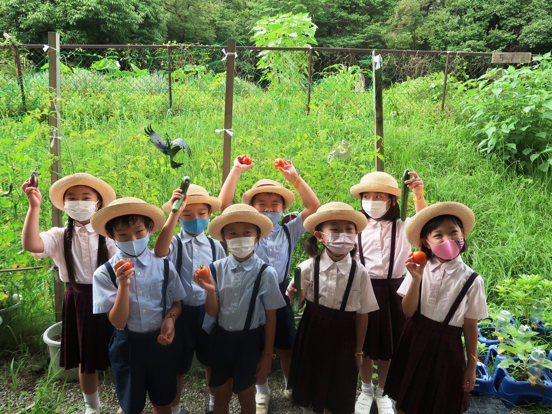 里山 461.夏野菜収穫(2年生) 2021年8月25日 2年生が、4月から育てた夏野菜(キュウリ、ナス、トマト)を収穫しました。 生活の時間に種を蒔き、どうしたらおいしい野菜ができるのかをみんなで考えて大切に育てました。 毎日水やりをしたり、脇芽をとったり、肥料をまいたりと、それぞれ考えた世話を実践し、たくさんの野菜が収穫できました。 児童たちは「やったあ。」と嬉しそうに収...