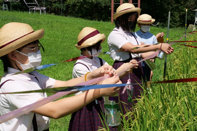 里山 465.鳥よけづくり(4年生) 2021年8月28日 8月28日(土)に、4年生が稲の鳥よけを作りました。 4年生は5月からお米づくりに取り組んでいます。8月下旬に入って、稲穂の実が膨らみ始めたので、鳥から稲を守る必要が出てきました。 タブレットで鳥が忌避するものの特徴を調べ、鳥よけを作りました。田んぼを囲うようにテープを張って、鳥よけを取り付け、豊作になりますようにと願...