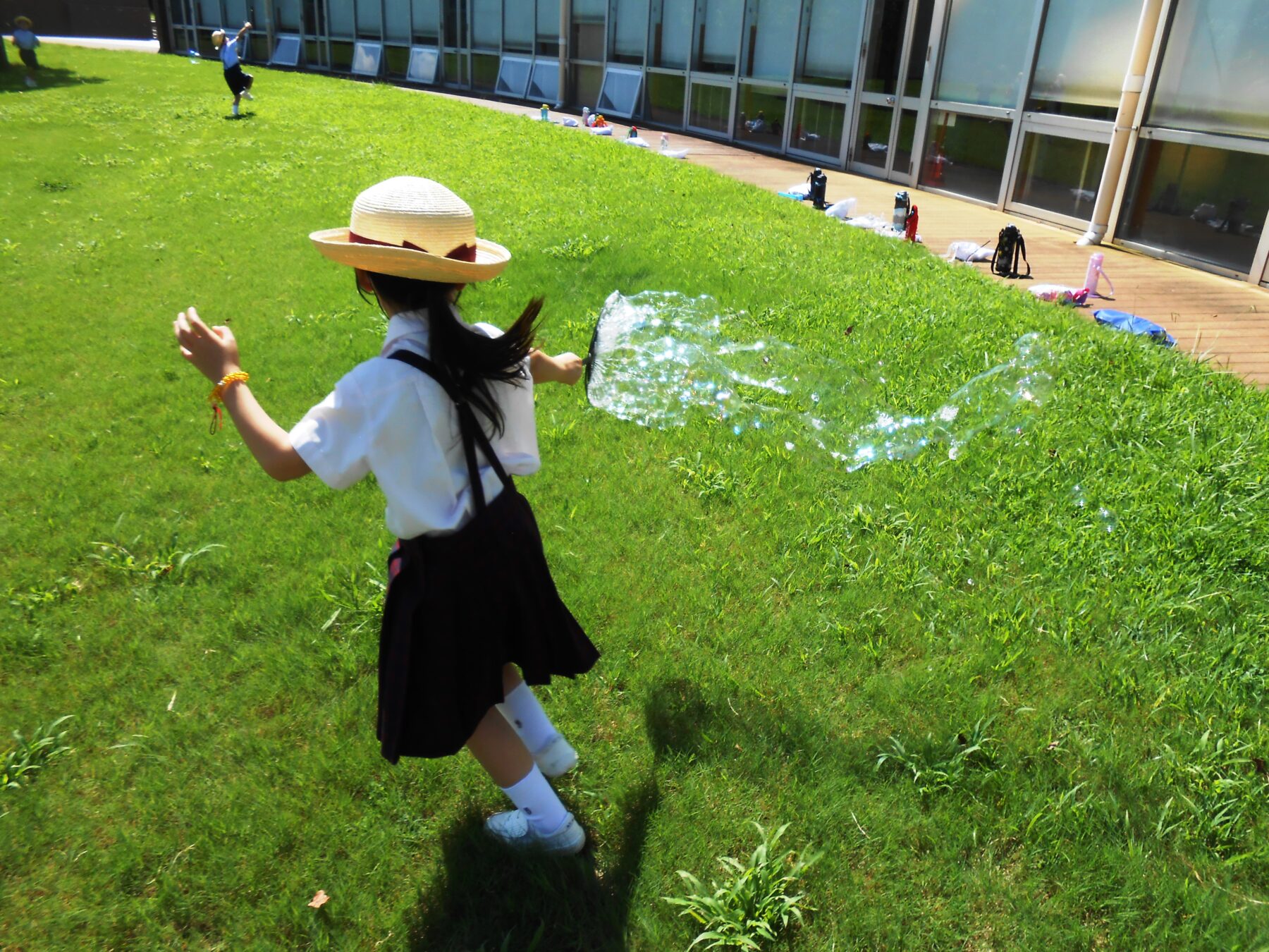 授業 464.シャボン玉遊び(1・2年生) 2021年8月27日 8月27日(金)に1年生と2年生がそれぞれ、生活科の授業の一環でシャボン玉遊びをしました。 ストローや針金、うちわなど、色々なものを使ってシャボン玉を作ることができました。 また、シャボン液に絵の具を混ぜて、バブルアートにも挑戦しました。 色がついたシャボン玉を画用紙に吹き付けて、思い思いの作品を作りました。 児童たち...
