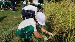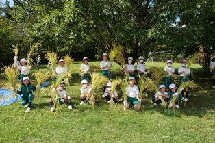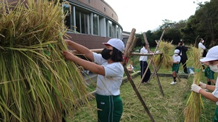 里山 468.稲刈り(4年生) 2021年10月5日 2021年10月11日 10月5日(火)に4年生が稲刈りをしました。 5月から校内の田んぼで育ててきた稲の穂がたわわに実り、いよいよ収穫の時期となりました。 児童たちが自ら鎌を持ち、1束ずつ稲を刈りました。刈った稲はみんなで協力して束にし、はざ掛けをしました。 児童たちは作業の大変さに驚きながらも、一生懸命に作業を進めていくうちにどんどん楽しくなってきたようで、積極的に稲刈りやはざ掛けをしていました。 鎌を使う児童 はざ掛け みんなで記念撮影① みんなで記念撮影②