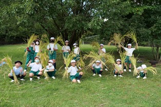 里山 468.稲刈り(4年生) 2021年10月5日 2021年10月11日 10月5日(火)に4年生が稲刈りをしました。 5月から校内の田んぼで育ててきた稲の穂がたわわに実り、いよいよ収穫の時期となりました。 児童たちが自ら鎌を持ち、1束ずつ稲を刈りました。刈った稲はみんなで協力して束にし、はざ掛けをしました。 児童たちは作業の大変さに驚きながらも、一生懸命に作業を進めていくうちにどんどん楽しくなってきたようで、積極的に稲刈りやはざ掛けをしていました。 鎌を使う児童 はざ掛け みんなで記念撮影① みんなで記念撮影②