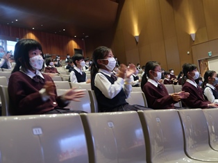 音楽鑑賞会は、本校講堂で、新型コロナウイルス感染防止のため、小学部・中学部・高等部の3部に分け、児童が座る席も間隔をあけて実施しました。児童たちにとってとても馴染みのある曲をたくさん披露してくださいました。児童たちは曲に合わせて手拍子をしたり、一生懸命拍手をしたりと、とても楽しい時間を過ごすことができました。
