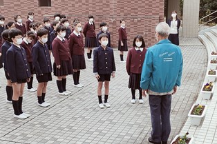 パンジーを植えたプランターは講堂の入り口横に並べ、いつでも目に入るようにしています。