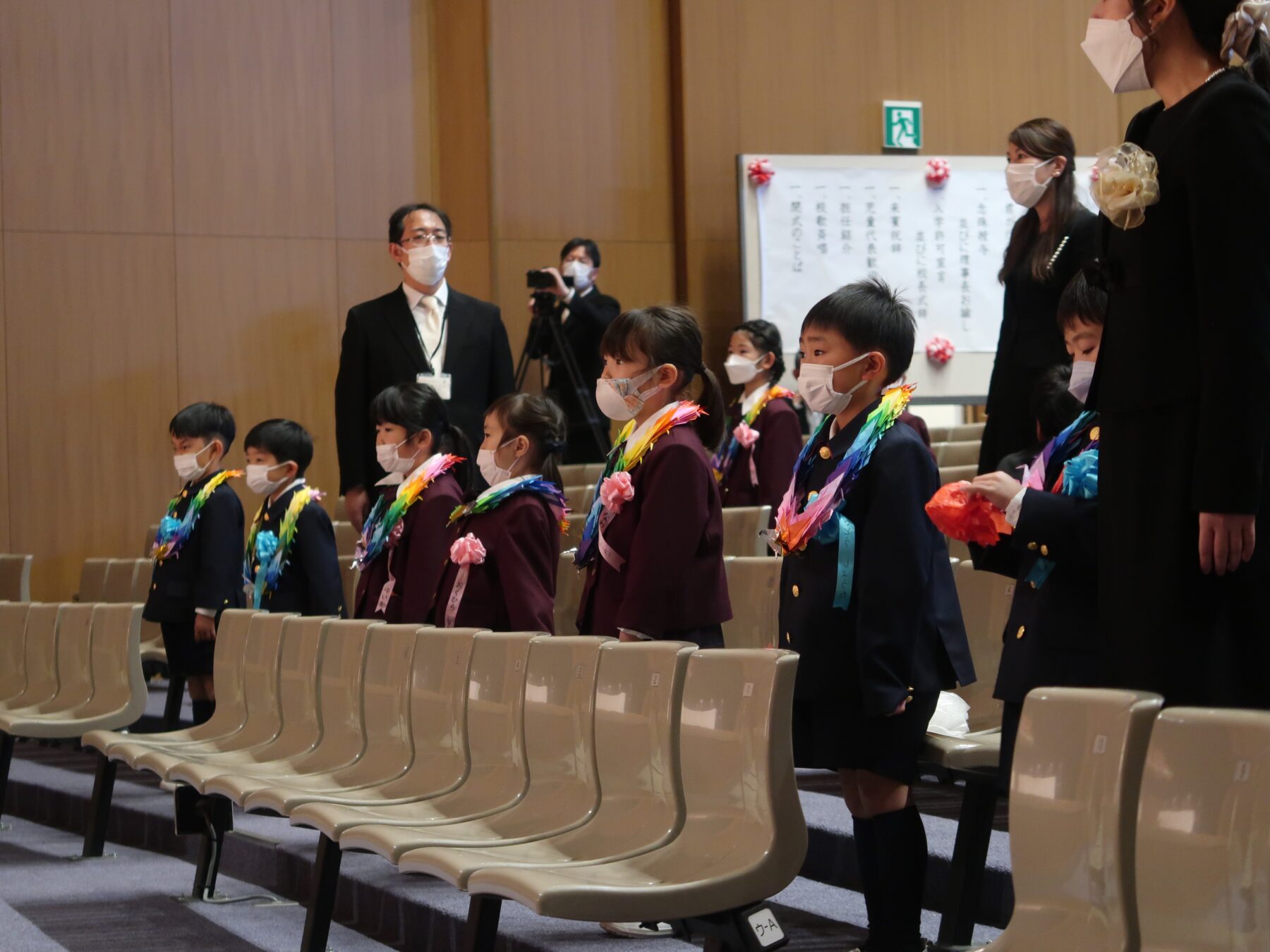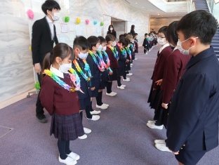 新入児は保護者の方と一緒に、真新しい制服に身を包み、大きなランドセルを背負ってスロープを上ってきました。今年は2~4年生の児童は参列できませんでしたが、5、6年生は入学式に参列し、登校してきた新入児に挨拶をしたり、教室までの誘導をしたりしました。新入児は2年生が作った折り鶴のレイを5年生からかけてもらい、晴れやかで嬉しそうな様子でした。また、廊下に掲示された3、4年生からのお祝いのメッセージを保護者の方と一緒に喜んで見ていました。