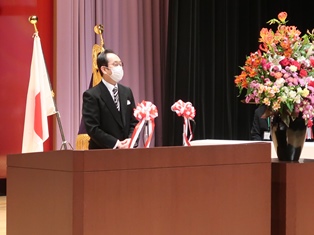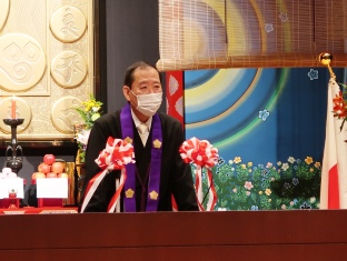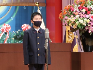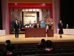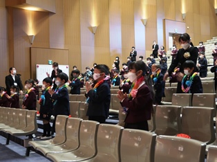 参列者の温かな拍手に迎えられて新入児が入場し、入学式が始まりました。念珠授与では、新入児達は少し緊張した面持ちで講堂の舞台に上がり、理事長先生から一人ひとりに念珠が手渡され、「頑張ります!」と大きな声で応えることができました。