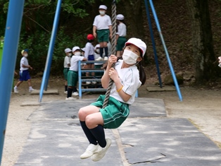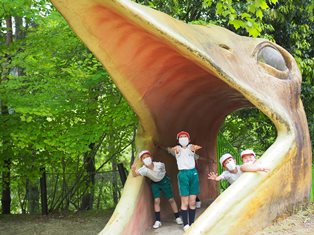 午前中は恐竜の国の大型遊具で体を動かしました。ロープでできたジャングルジムに登ったり、ターザンロープで遊んだりして、児童たちは楽しんでいました。