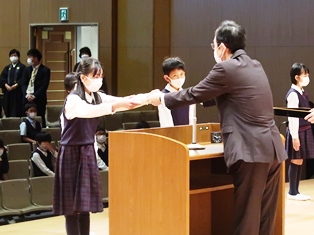 5・6年生の選挙によって選出された児童会役員に、校長先生から任命書が授与されました。児童会会長が所信表明を行い、「挨拶をしっかりして、より元気で明るい学校にしましょう。」と児童に呼びかけました。
