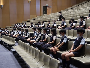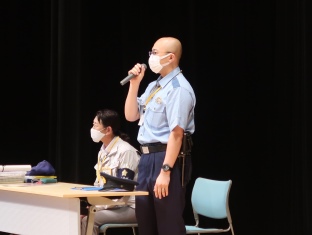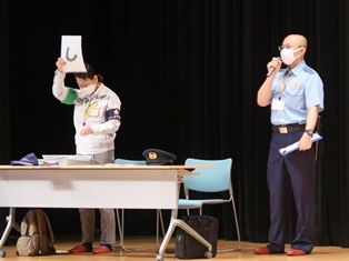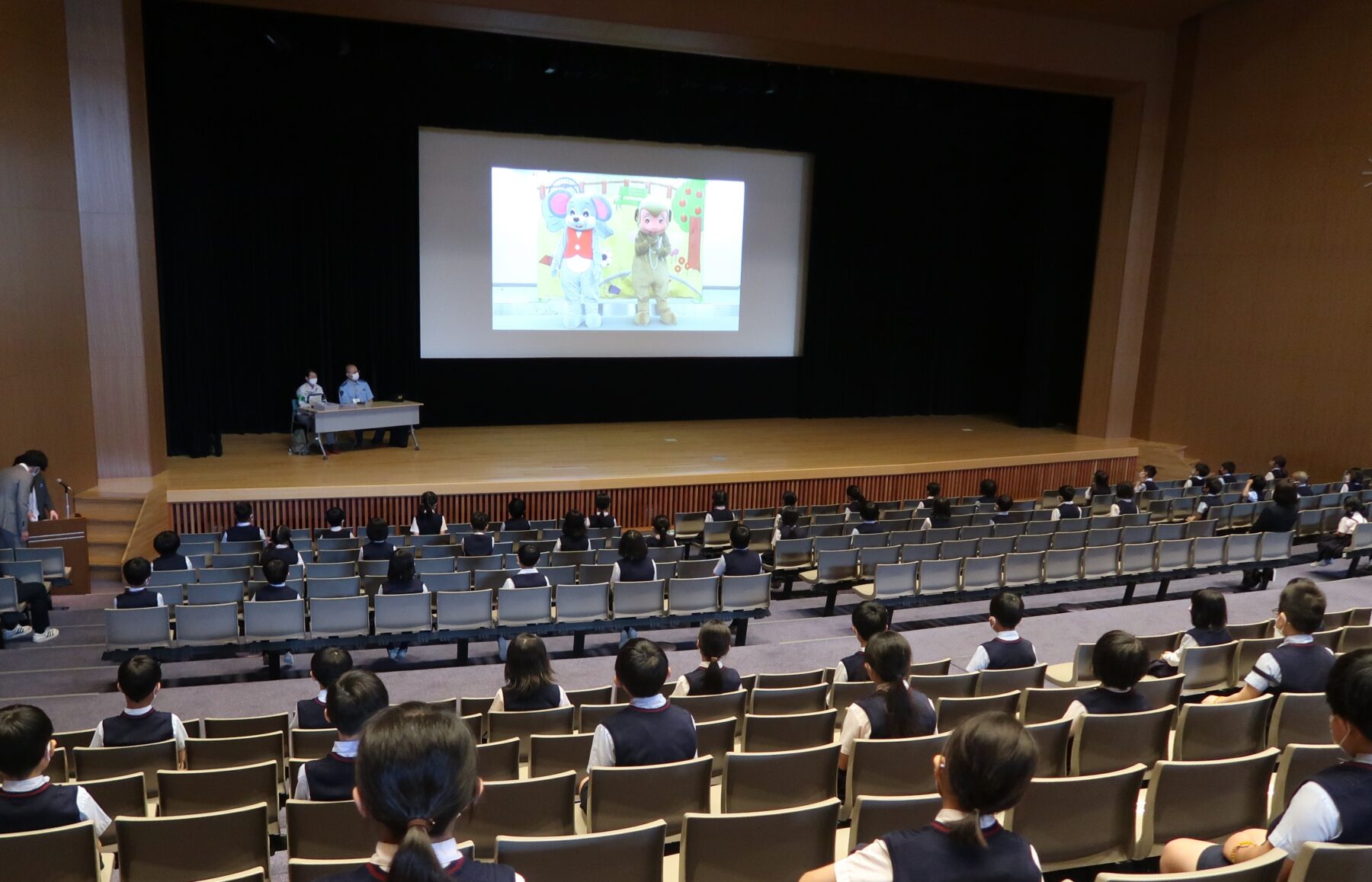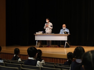 奈良県香芝警察署生活安全課の梅﨑様と、スクールサポーターの窪田様にお越しいただき、自分のいのちを守る大切さや、不審者への対処法「いかのおすし一人前」について、クイズや映像を交えながらわかりやすく教えていただきました。