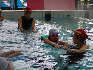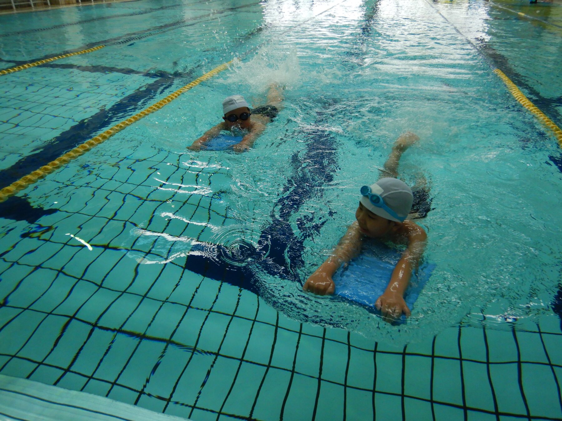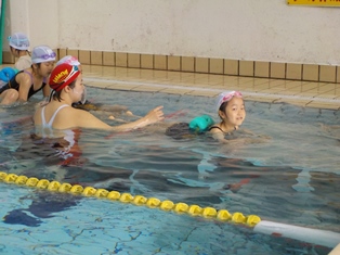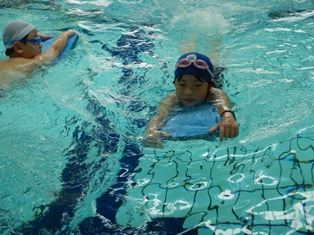 児童たちは泳力ごとにグループに分かれて、息つぎの仕方や泳ぎ方など、スポーツクラブのコーチから優しく丁寧に指導してもらいました。