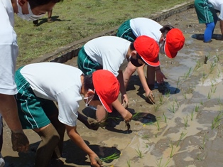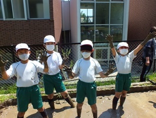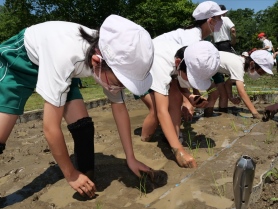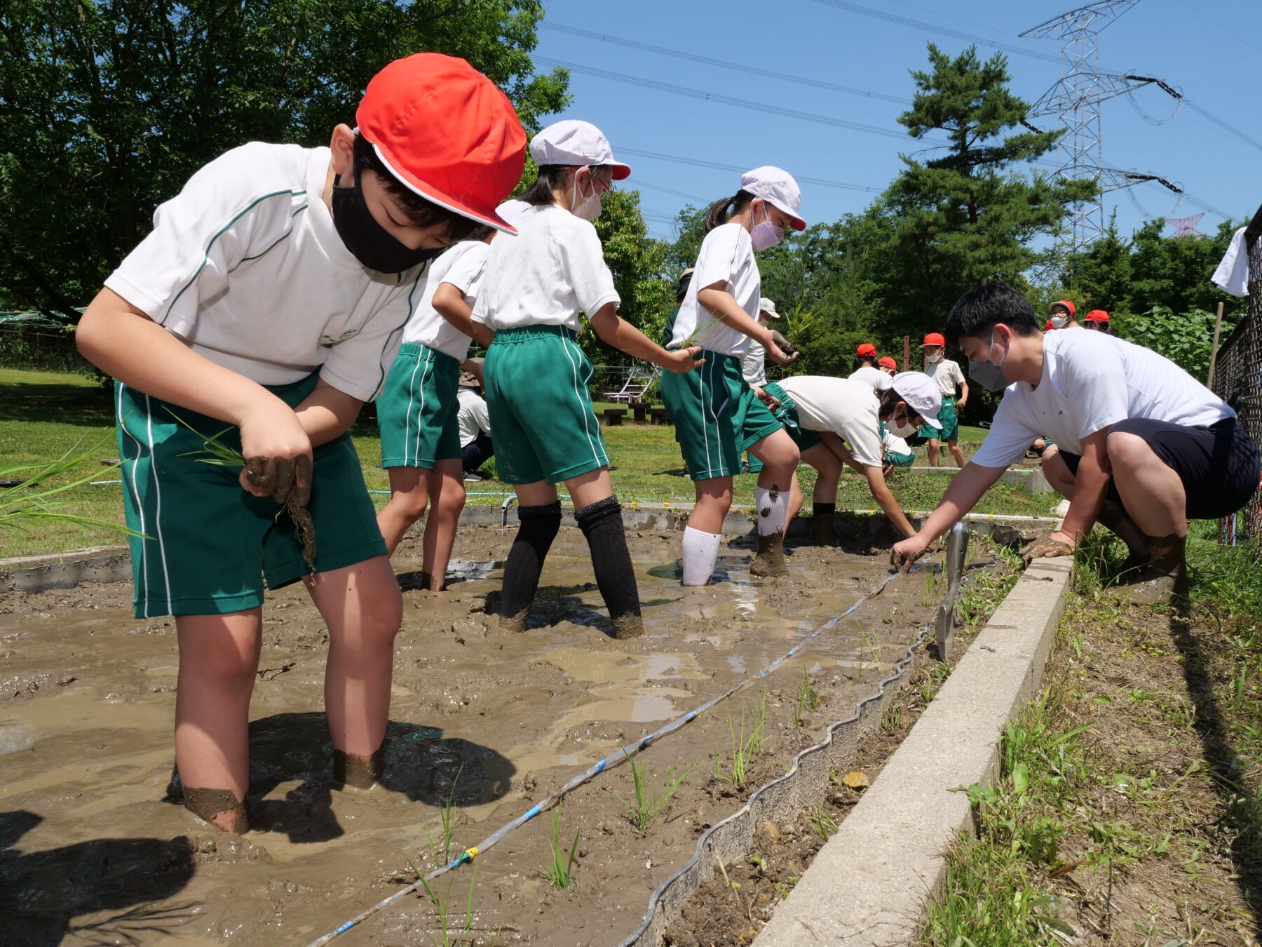 田植え当日は、4年生の保護者の有志の方にもご協力いただき、4年生児童みんなで田植えをしました。初めて田植えに挑戦する児童もいましたが、上手に苗を植えることができました。ひと苗ずつ丁寧に、大きく育つことを願いながら植えることができました。