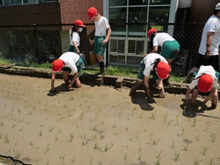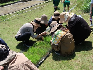 カレッジの4年生は総合の学習でお米を育てます。5月頃から、種もみを塩水選し、芽出し、育苗、田起こし、代かきなどをみんなで協力して取り組んできました。
