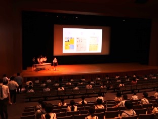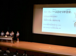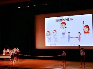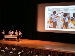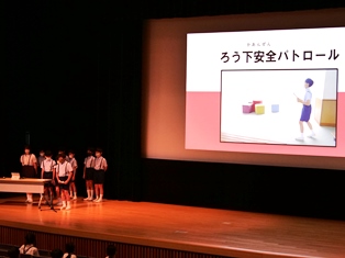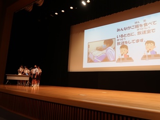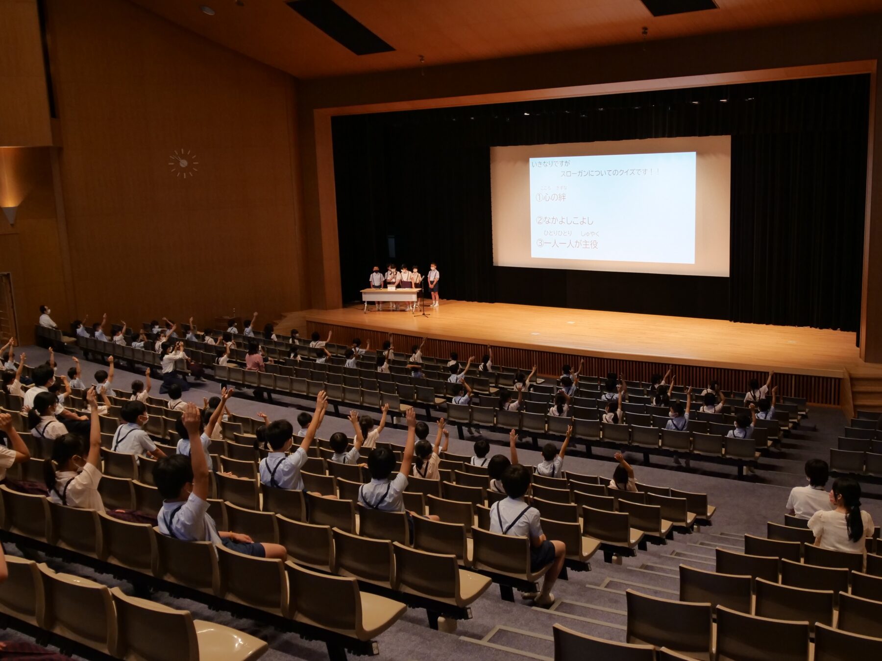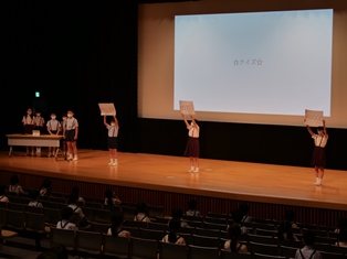 講堂で、7つの委員会が、今年の活動内容を紹介しました。どの委員会も活動内容を充実させ、学校をよりよくしようと頑張っています。それぞれの委員会が、写真や動画を見せ、クイズを取り入れるなどして、下級生にもわかりやすく楽しく説明しようと工夫していました。