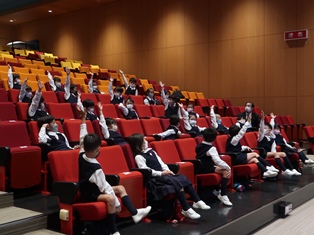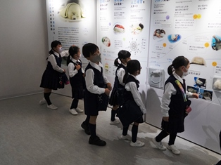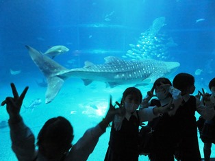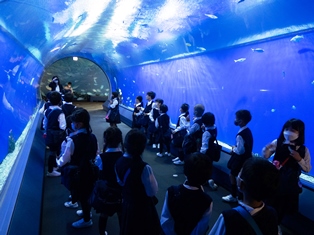 午前中は海遊館内を見学しました。様々な生き物を間近で見ることができて、児童は一生懸命様子を観察していました。また、大きな水槽を優雅に泳ぐジンベイザメの大きさにびっくりしていました。午後からは海遊館アカデミーを受講しました。飼育員の方から、アシカやアザラシ、ペンギンなどの特徴や、動物の挨拶と人間の挨拶の違いなどを教わりました。また、クラスごとにジンベイザメと同じ大きさをかたどった布の前でみんなで並んでみて、その大きさを体験しました。