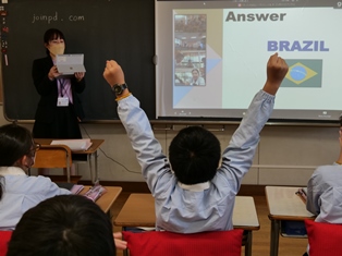 互いにクイズを出し合いました。児童は英語の問題に英語で答え、レッドランズカレッジの高校生は日本語の問題に日本語で答えます。言葉だけでなく、ジェスチャーでヒントを出したり、正解したらgoodのサインを出したりして、コミュニケーションを図りました。質問をし合って会話の勉強もできました。