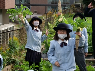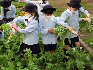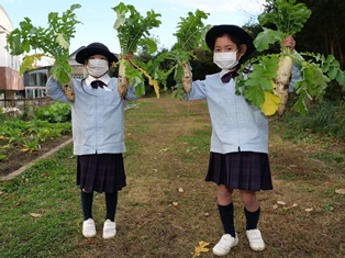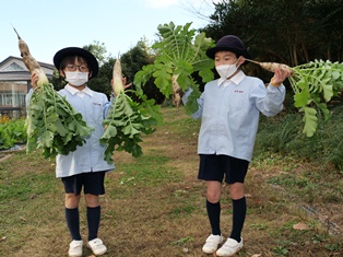 里山 531.ダイコンの収穫(2年生) 2022年12月1日 2022年12月15日 12月1日(木)、2年生が生活科の授業に畑で育てたダイコンを、収穫しました。 9月に畑に種をまいて、水やりを一生懸命して大切に育ててきました。 児童は力を合わせて土の中から大きく成長したダイコンを引き抜きました。 「水やりを頑張ってよかったな。」「とっても大きなダイコンに育ったよ。」と児童は、自分たちが育てたダイコンを抱えて嬉しそうにしていました。