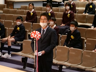 卒業生は、ご来賓や、保護者の皆様、4・5年生の児童と教員の大きな拍手に迎えられて入場しました。校長先生から一人一人に卒業証書を渡され、「ありがとうございました」と受け取りました。理事長先生、校長先生、育友会会長様のお話を真剣なまなざしで聞いていました。