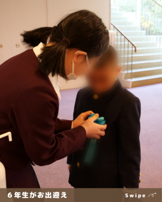 受付では6年生がお出迎え。新入児は6年生と一緒に教室に向かいました。