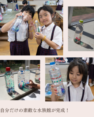魚の形をした容器に好きな色を塗ったり、ペットボトルの中に好きなビー玉やおはじきやモールを入れたり、ペットボトルの外側に絵を描いたりと、友達とわいわい話しながら自由に作っていました。