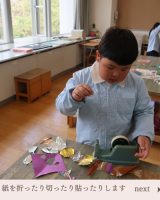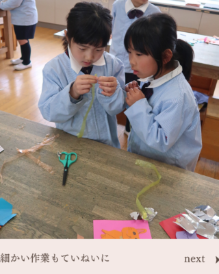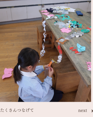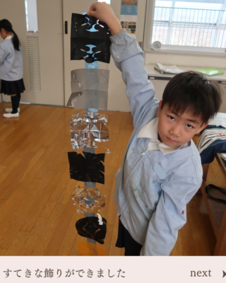 授業 611.ちょきちょきかざりをつくろう 2024年1月16日 2024年2月1日 1年生が工作をしました。 紙を折って、好きなところに切り込みを入れました。 開いてみると、おもしろい形になりました。 たくさん作ってつなげてみました。 お気に入りの飾りを友達同士で見せ合っていました。